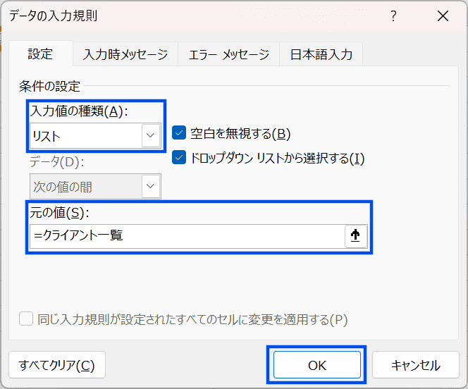 • [入力値の種類:]を[リスト]>[元の値:]に「=クライアント一覧」と入力して[OK]をクリック