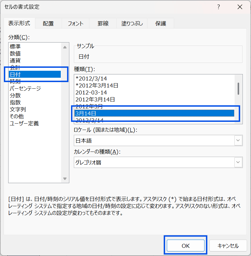 • [表示形式]タブの[分類:]を[日付]にして、[種類:]で[〇月〇日]表示パターンを選択して[OK]をクリック