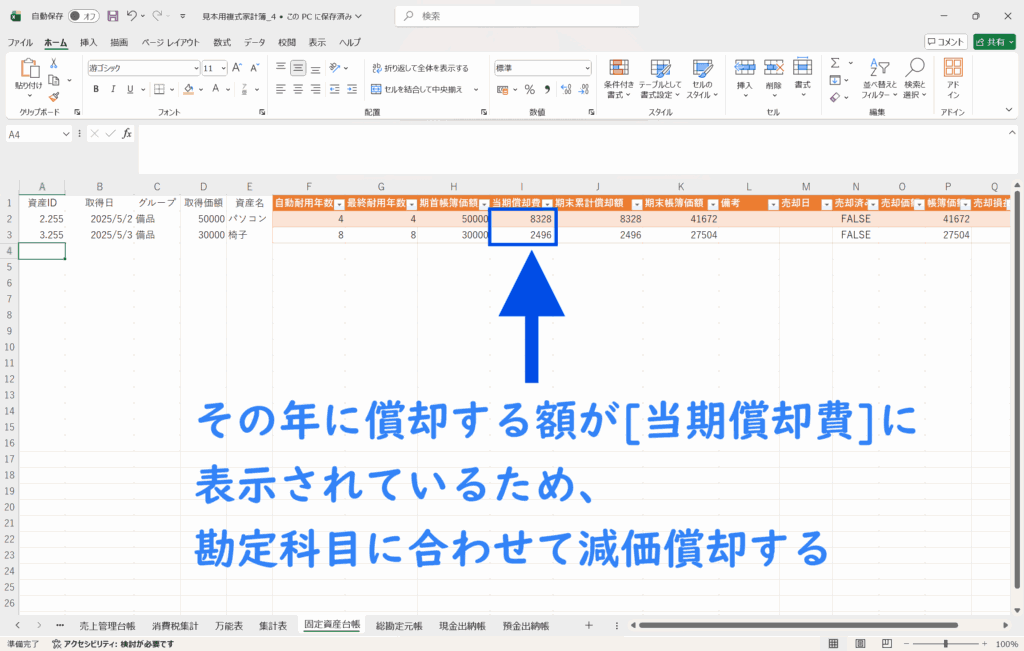 • 「固定資産台帳」シートを開き、[当期償却費]列にて償却額を確認
