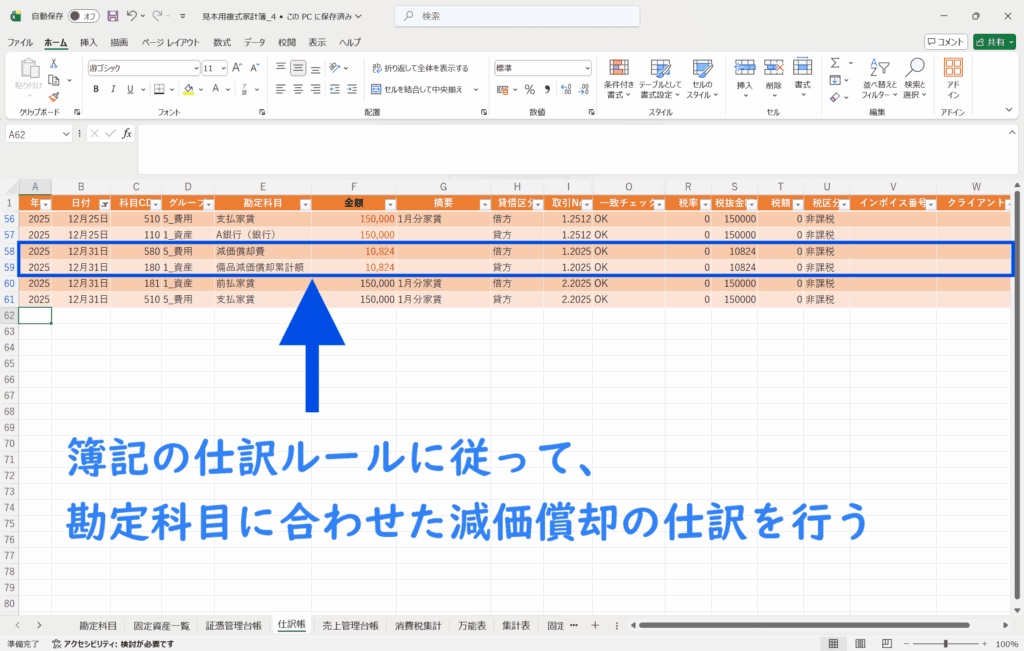 • 「仕訳帳」シートにて、簿記ルールに合わせて減価償却の仕訳をする