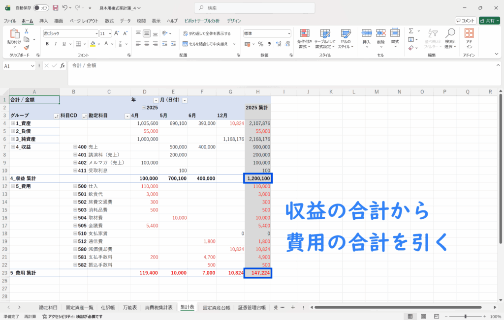 • 「集計表」シートを参照して、収益の合計から費用の合計を引いて損益を算出する