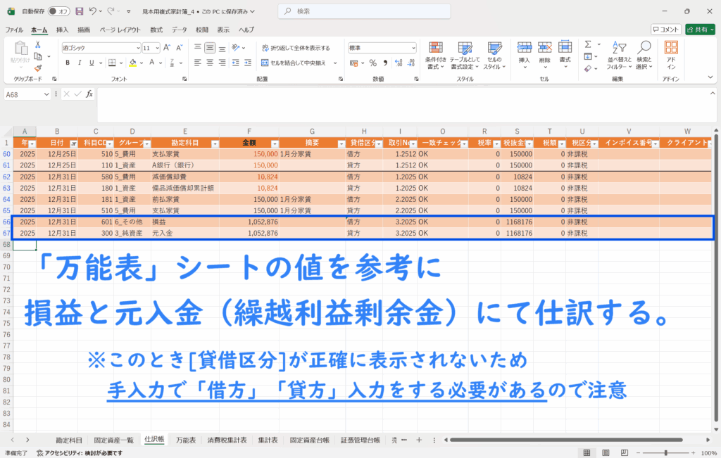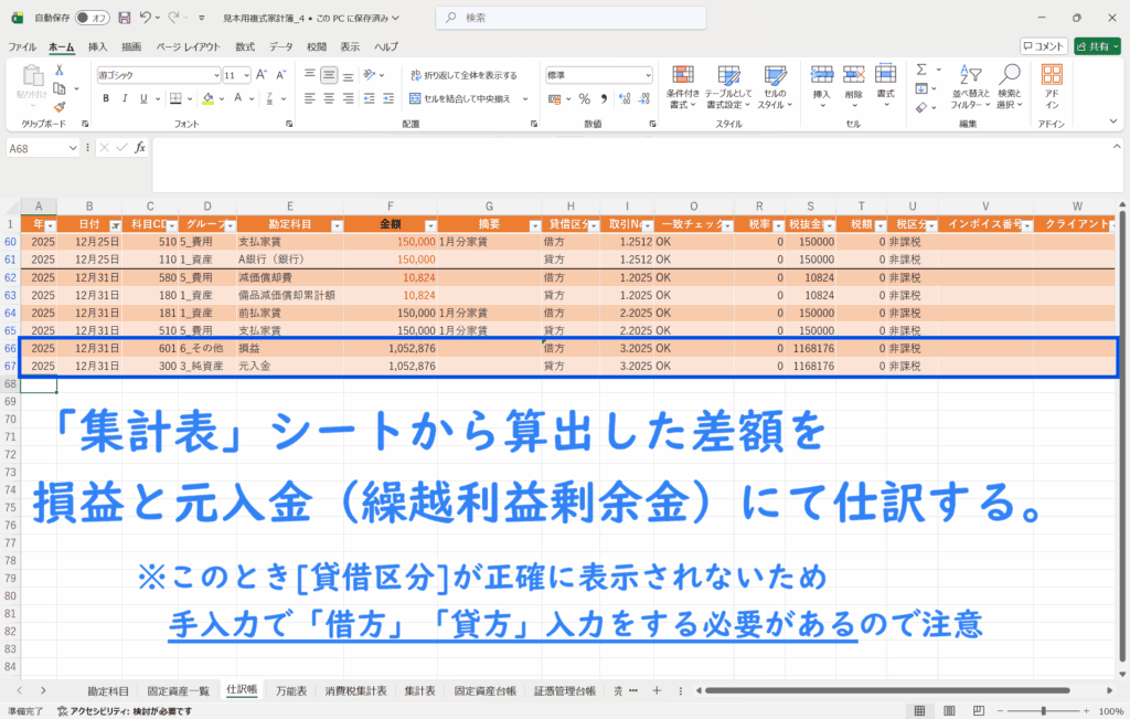 • 「仕訳帳」シートにて、損益と元入金(繰越利益剰余金)の仕訳をする