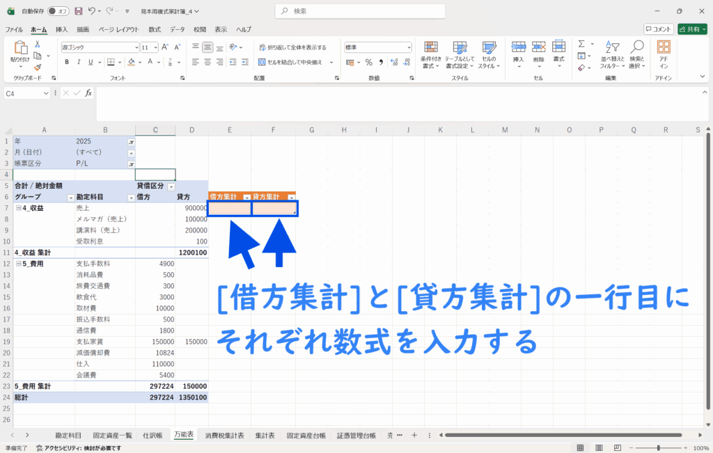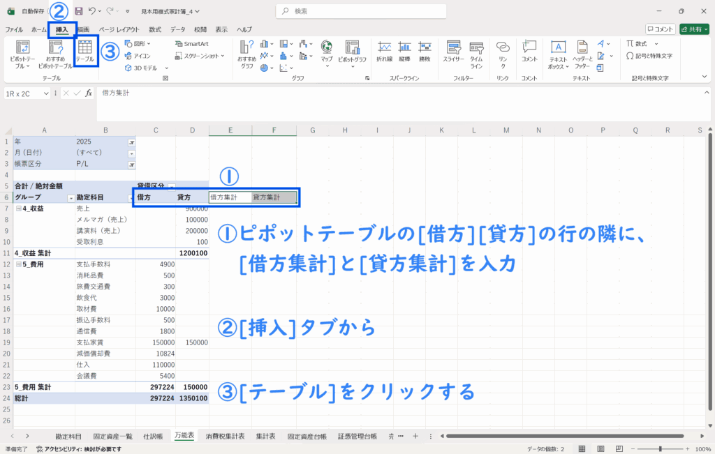 「万能表」シートに借方集計・貸方集計のテーブルを作成する