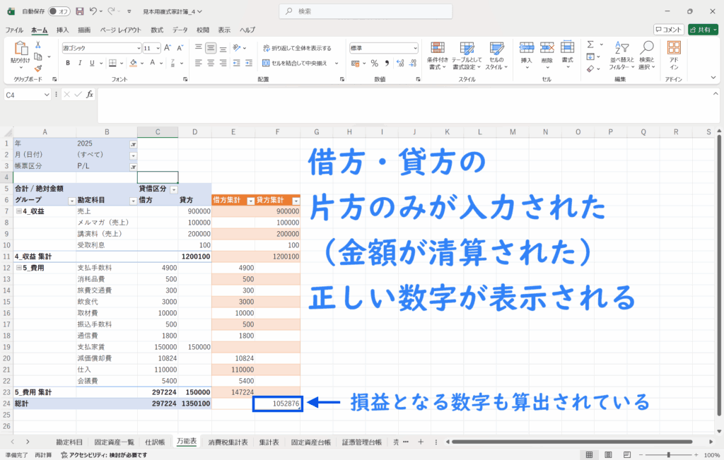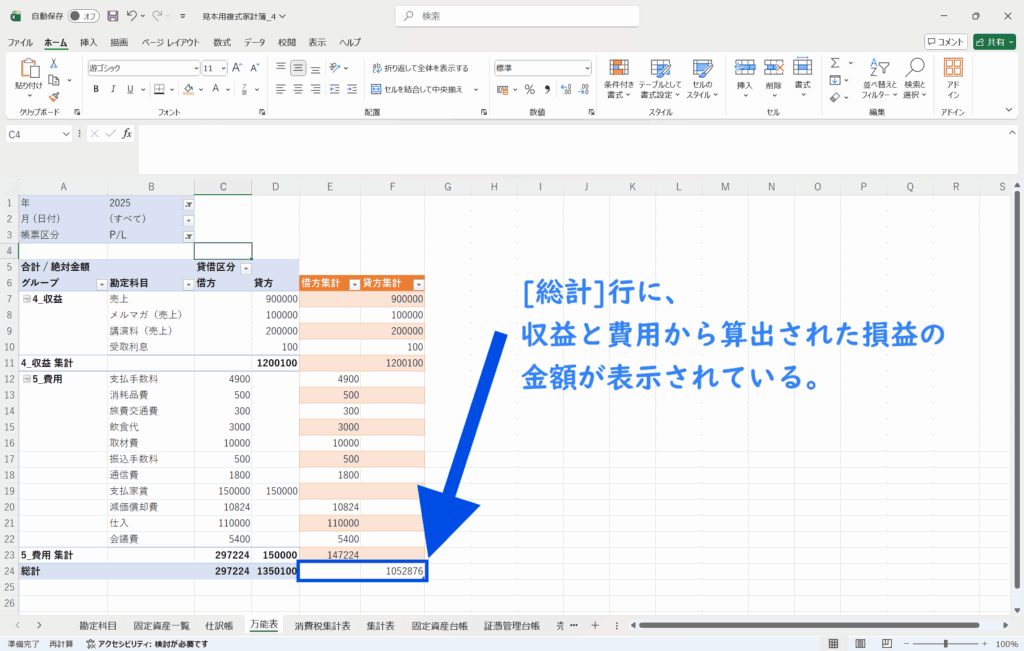 • 「万能表」シートを参照して、[総計]行に表示されている収益と費用の差額金額=損益をメモ