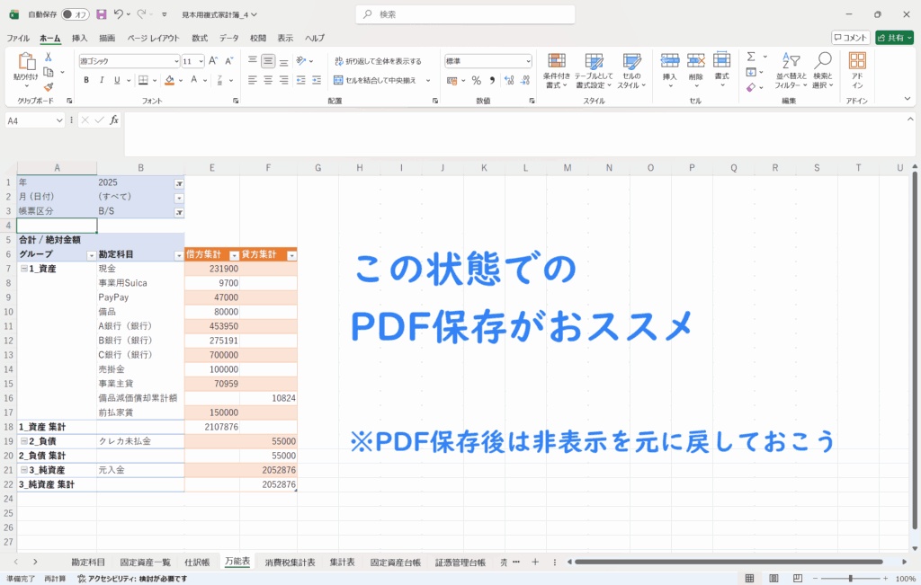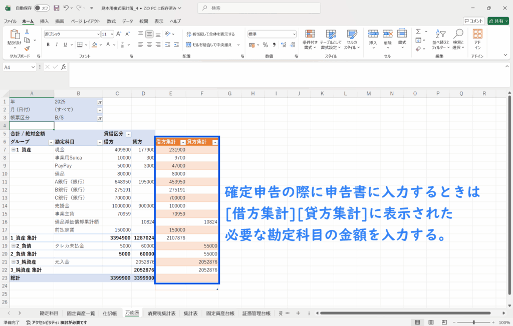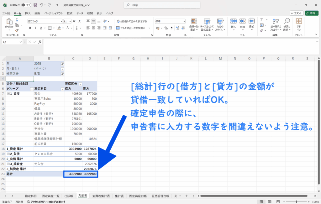 「万能表」シートの[帳票区分]フィルターを[B/S]に絞れば、基本的にはOK。
