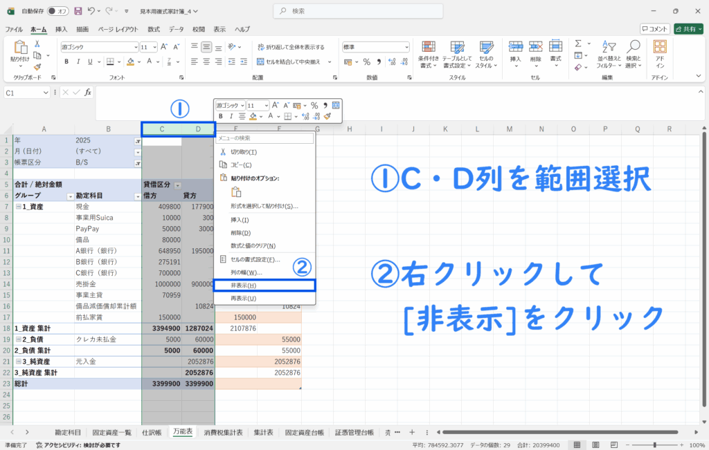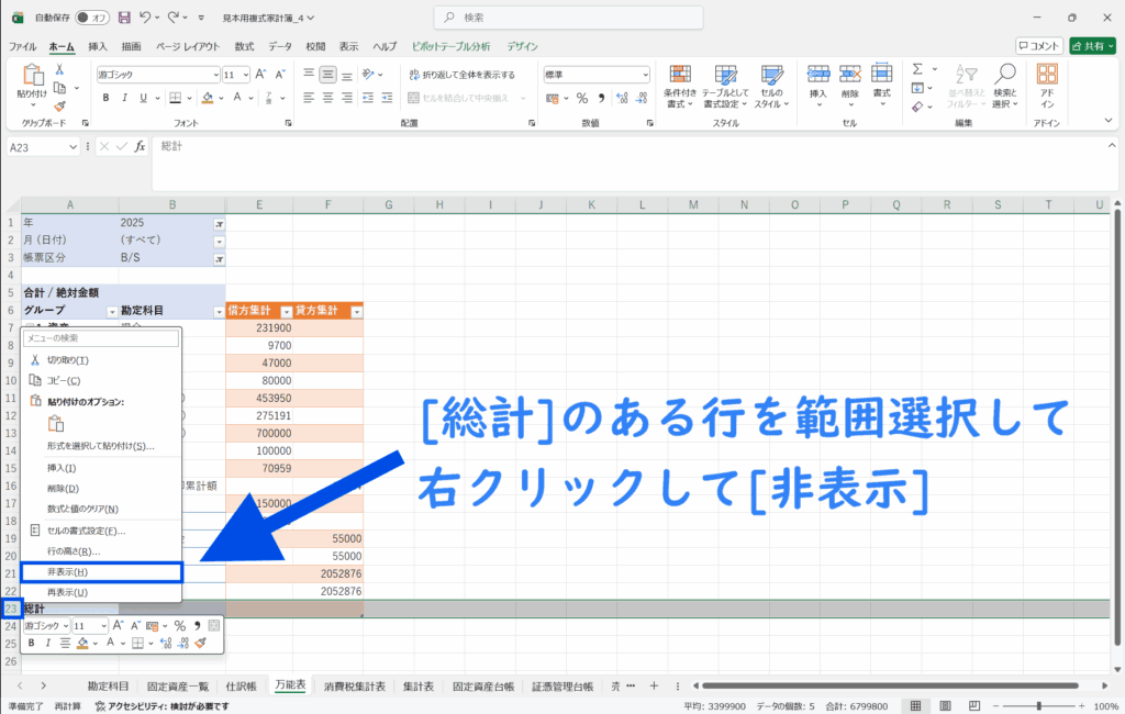 • [借方][貸方]のある列や[総計]のある行を右クリックして[非表示]に