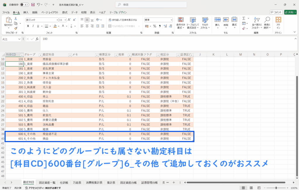 なお、現金過不足などどの(資産や負債など)どのグループにも属さない勘定科目は、「勘定科目」シートにて「6_その他」など6番目のグループとして用意しておくと便利。