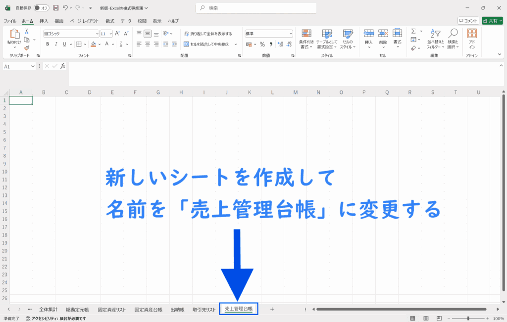 - ①新しいシートを作成して、名前を「売上管理台帳」に変更する
