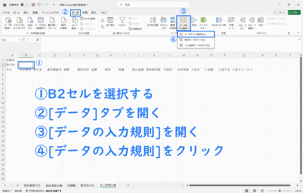 - ③B2セルを選択して、[データ]タブを開き、[データの入力規則]から[データの入力規則]をクリック