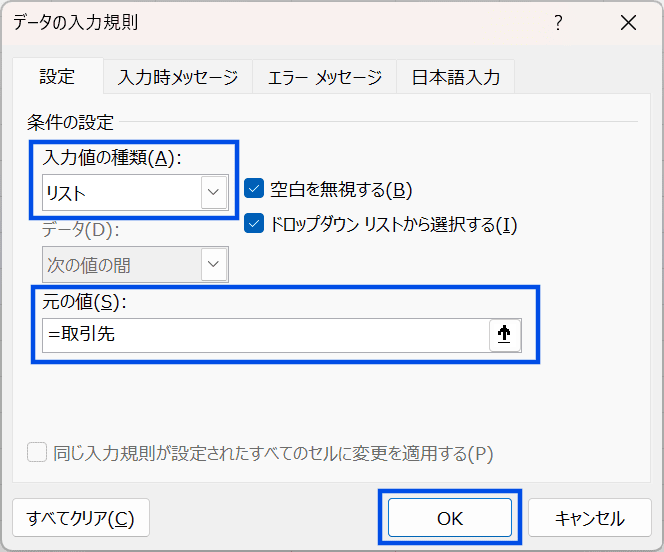 - ④[入力値の種類:]から[リスト]を選択し、[元の値:]に「=取引先」と入力して[OK]をクリック