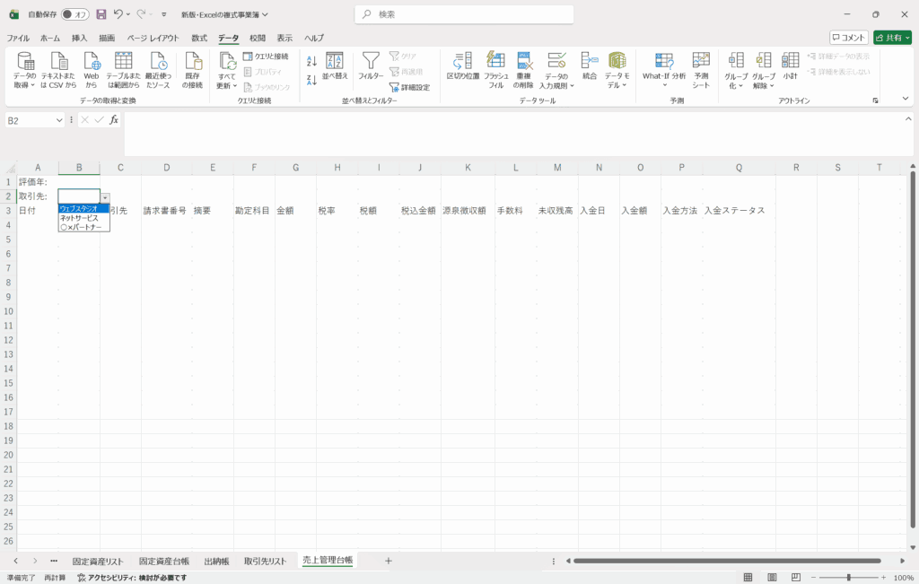 - ⑤「取引先リスト」シートに入力している取引先が、プルダウンリストから選べるようになる