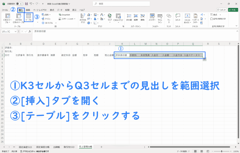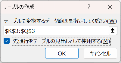 - K3からQ3の見出しを範囲選択して、[挿入タブ]を開き[テーブル]をクリック