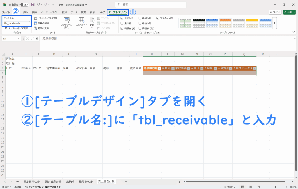 - ⑧[テーブルデザイン]タブを開いて、[テーブル名:]に「tbl_receivable」と入力