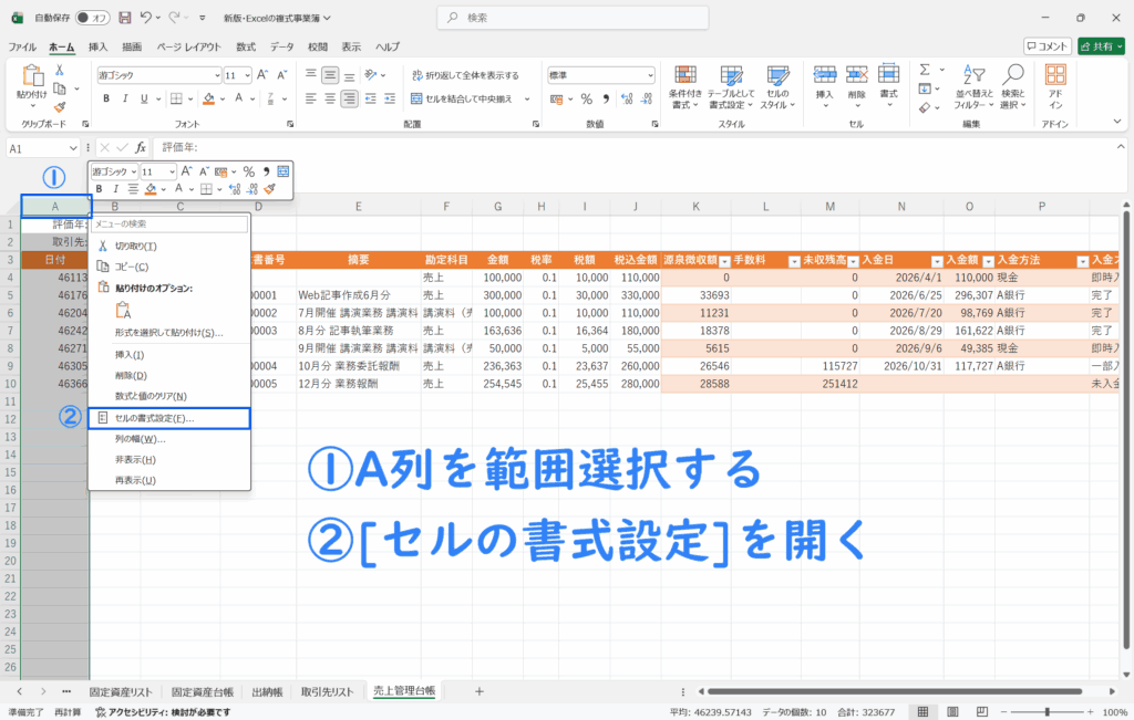 - A列全体を範囲選択して右クリックし、セルの書式設定から日付表示を正しく表示させる