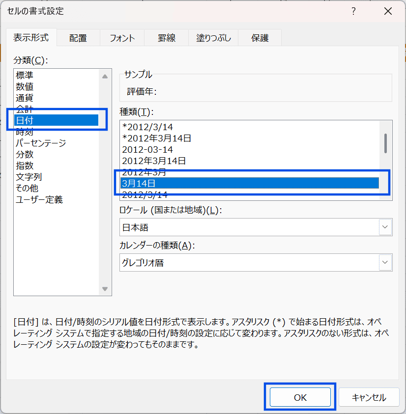 - [分類:]から[日付]を選択し、[種類:]から[○月×日]表示を選んで[OK]