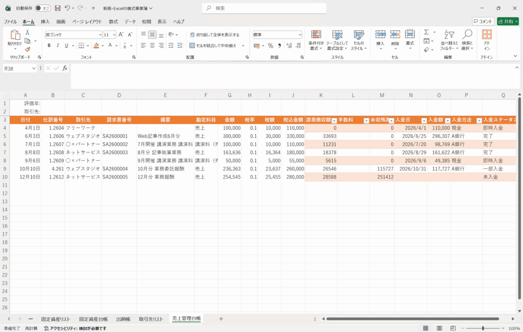 入金の仕訳が完了すると、「売上管理台帳」シートに自動的に入金額などが反映され、[入金ステータス]が[完了]となる。