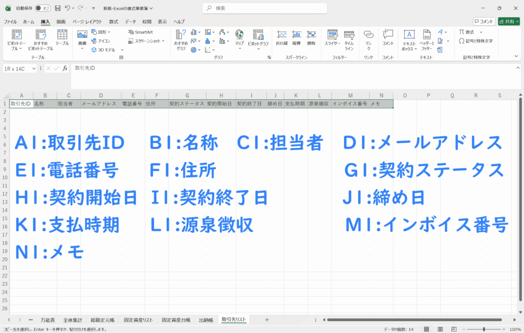 売上管理台帳を作成する前に、取引先を一覧でまとめておく「取引先リスト」シートを作成しておく。