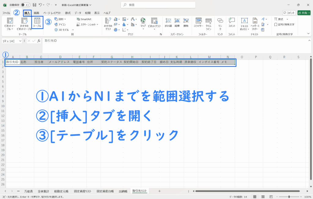 - ③入力したA1からN1までの見出しを範囲選択して、[挿入]タブから[テーブル]をクリック