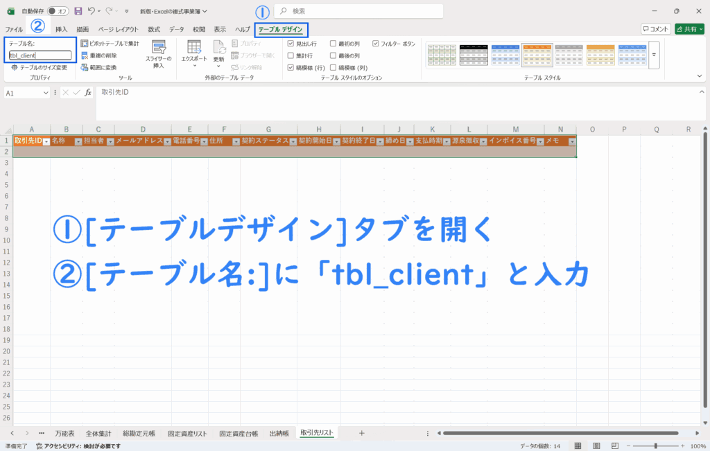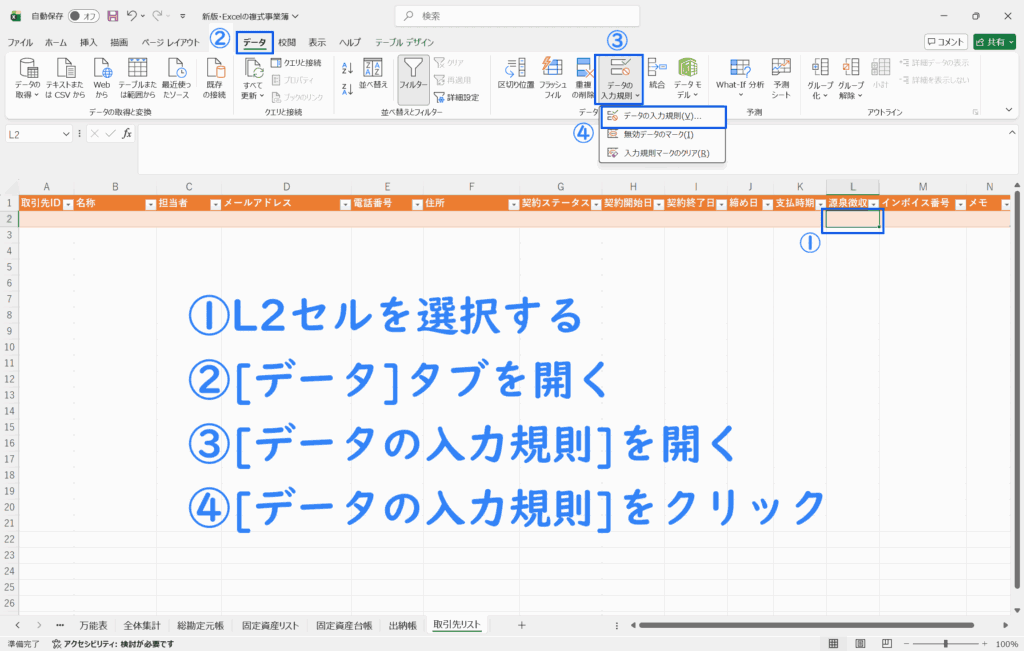 - ①新しいシートを作成して、名前を「取引先リスト」に変更する