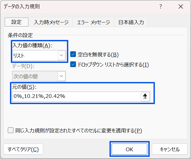 - ⑦[入力値の種類:]から[リスト]を選択して、[元の値:]に以下のように入力
