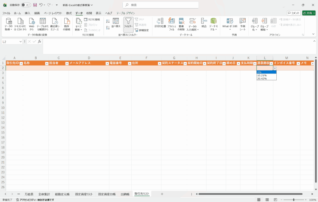 取引先に関しては必ずしも「取引先リスト」シートに入力しないといけないわけではなく、都度仕訳帳の[取引先]列に手入力してもOK。