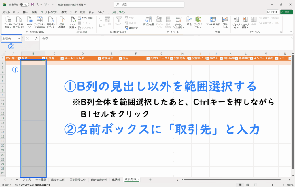 - ⑨B列の見出し以外を範囲選択して、名前ボックスに「取引先」と入力