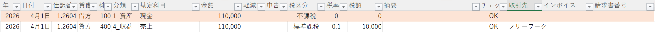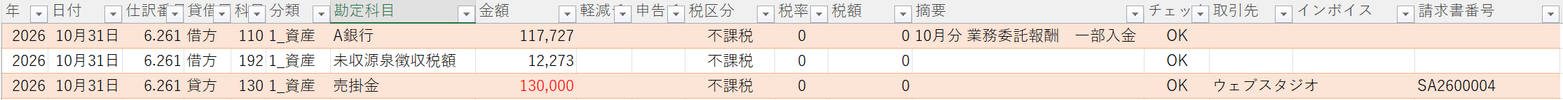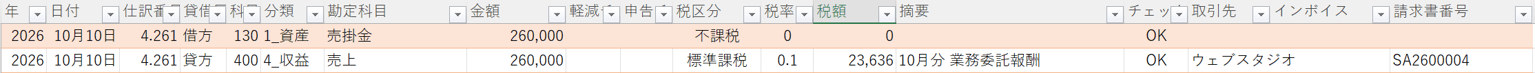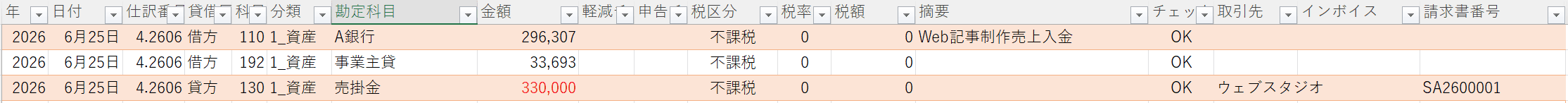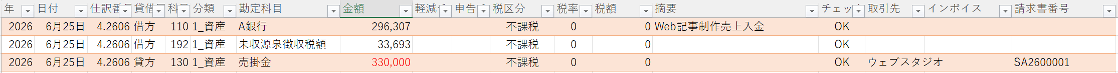 この場合も「仕訳帳」シートに[請求書番号]の入力が無いと、「売上管理台帳」シートに正確なデータが反映されないため注意。