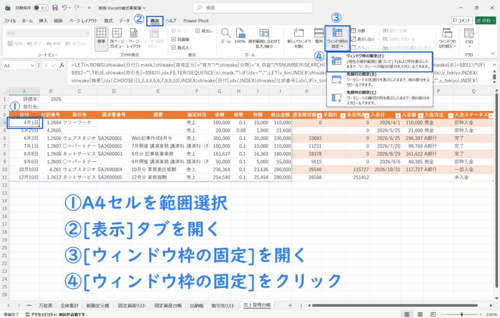 - ⑫A4セルをクリックして[表示タブ]から[ウィンドウ枠の固定]をする
