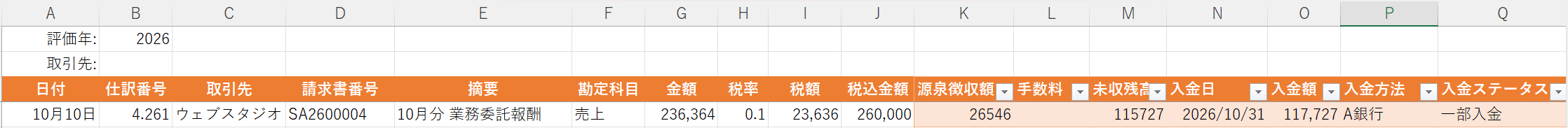 K3:源泉徴収額 L3:手数料 M3:未収残高 N3:入金日