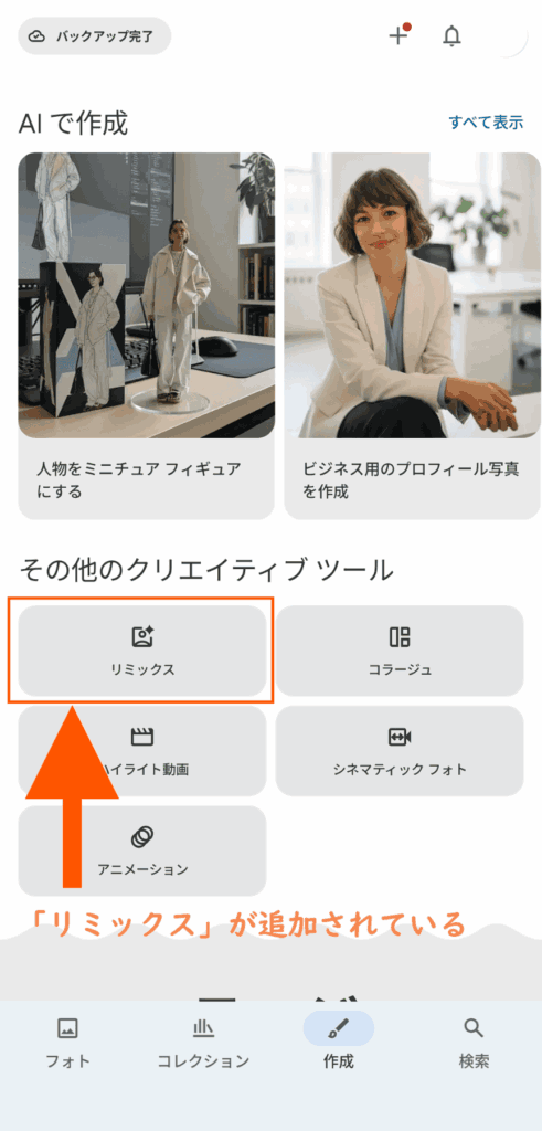『Googleフォト』アプリ内の下部[作成]タブを開き、「リミックス」が追加されている