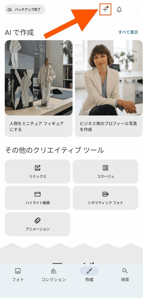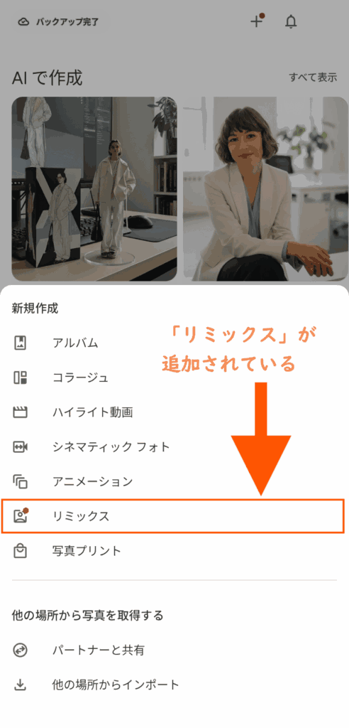 『Googleフォト』アプリ内上部の[+]をタップして、「リミックス」が追加されている