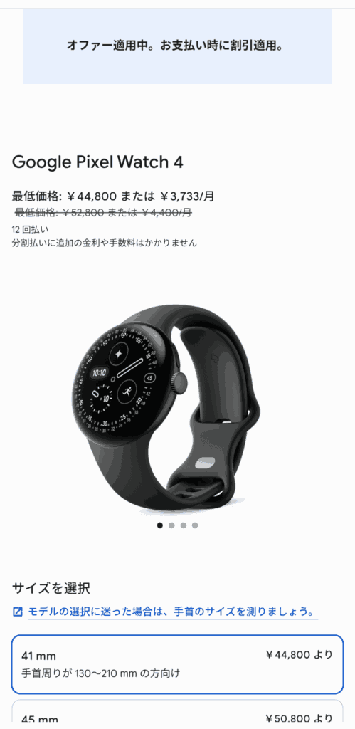 画像はGoogle Pixel Watch4の購入画面を進んだ例。