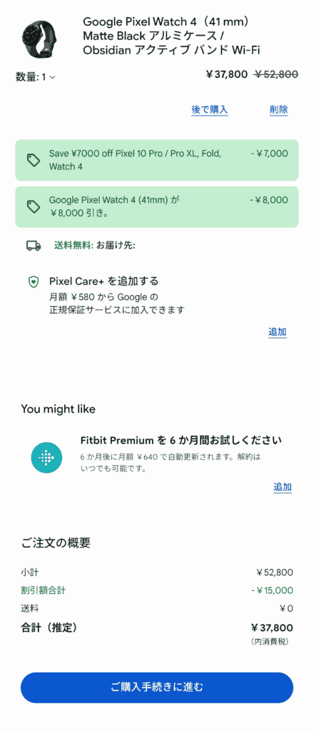またプロモーションコードの利用は一端末のみかつ一度のみに限られ、たとえばGoogle Pixel Watch4とPixel 10 Proを同時に購入しても、適用されるのは14,000円ではなく7,000円の表示となっている。