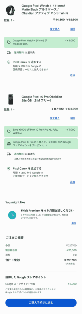 試しにGoogle Pixel Watch4とPixel 10 Proをオファー画面からカートに入れてみた例。