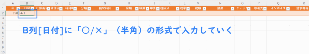 - ①B列の[日付]に「4/1」と入力して確定