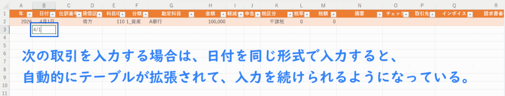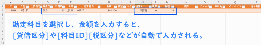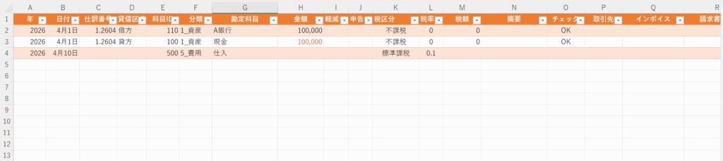 仕訳番号は自由な形式で入力OKだが、2026年4月1日の一回目の仕訳なら「1.2604」など分かりやすくしておくのがおすすめ。