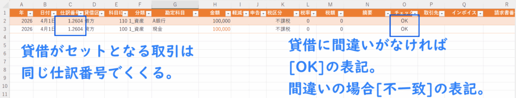 - ④[仕訳番号]に貸借で同じ番号を割り振る