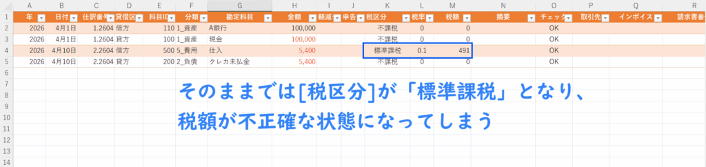 そのため該当科目で仕訳を入力すると税率欄に ⚠ が表示され、自動確定せず、取引ごとに自身で税区分を選択する仕組みとなっている。