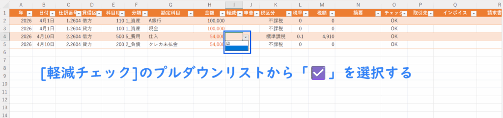 - ②[軽減チェック]でプルダウンリストから☑を選ぶ
