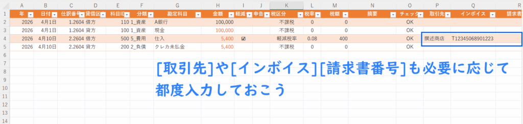 仕訳帳の項目にある[インボイス]と[請求書番号]は、その見出し名通りインボイス番号と請求書番号を入力していく箇所である。