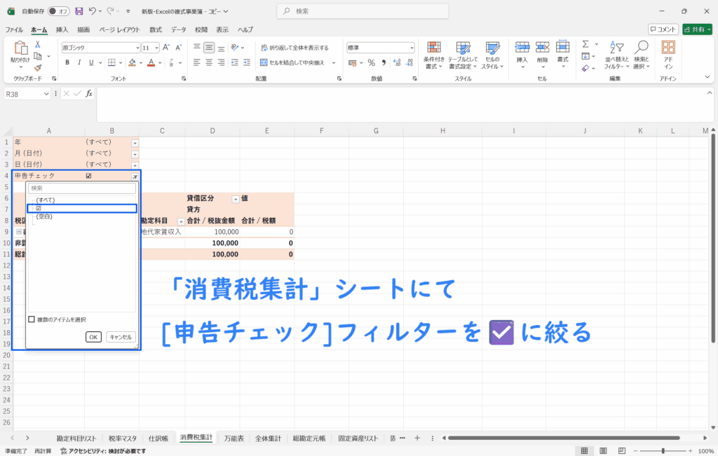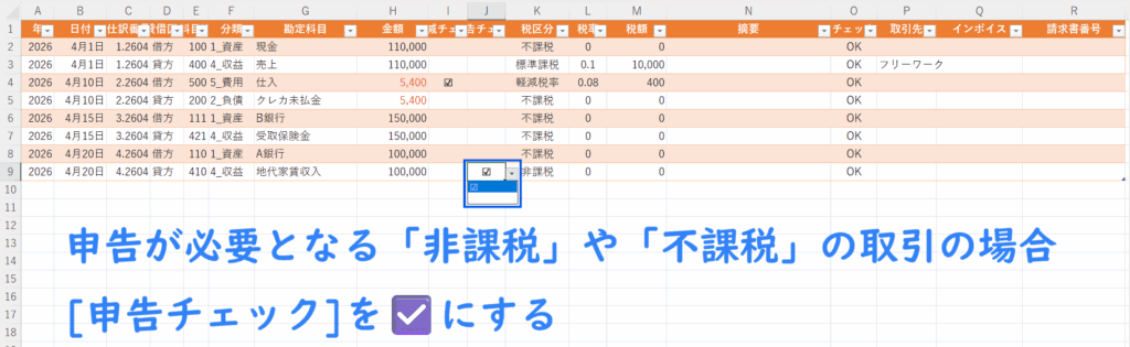 チェックを入れた取引のみを「消費税集計」シートにて抽出・集計することで、消費税申告時の金額確認を正確に行えるようにするためのもの。
