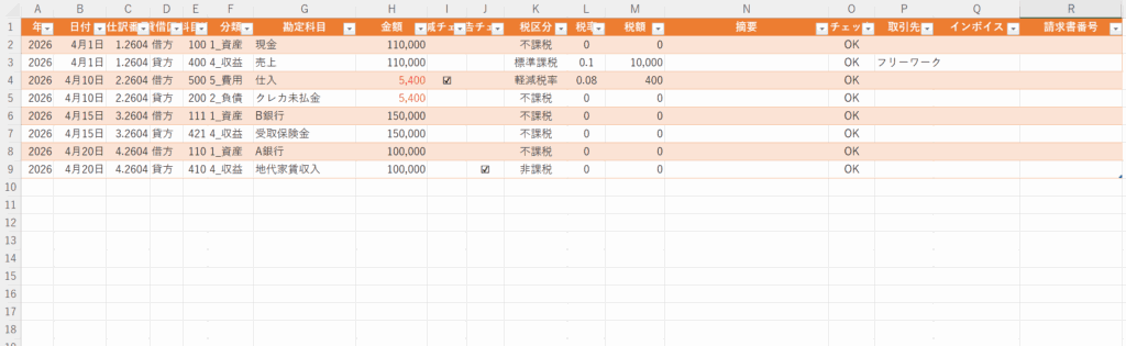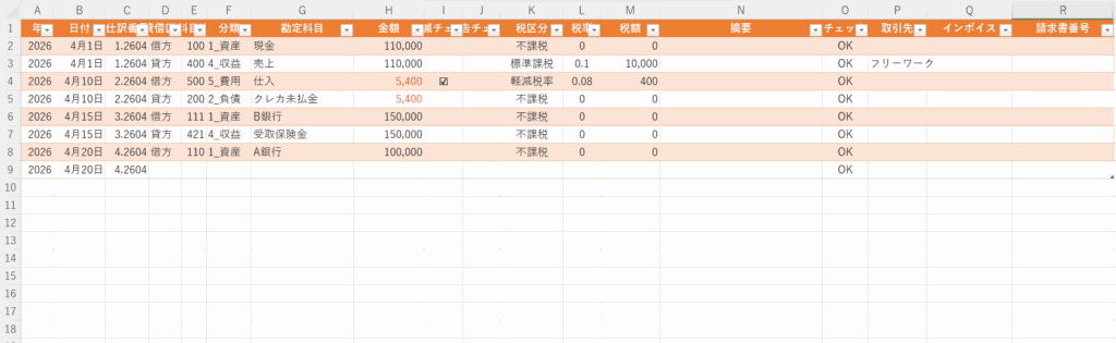 なお、税抜経理で運用したい場合は、「仕訳帳」シートから消費税関連の自動計算列を削除し、消費税勘定を用いて仕訳を行うことで対応できる。
