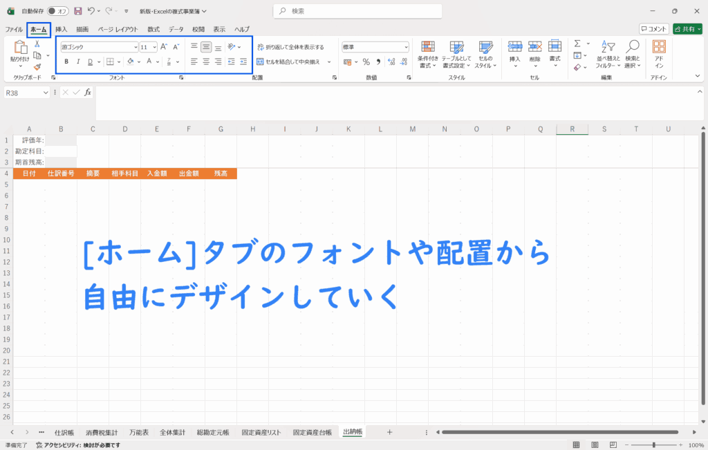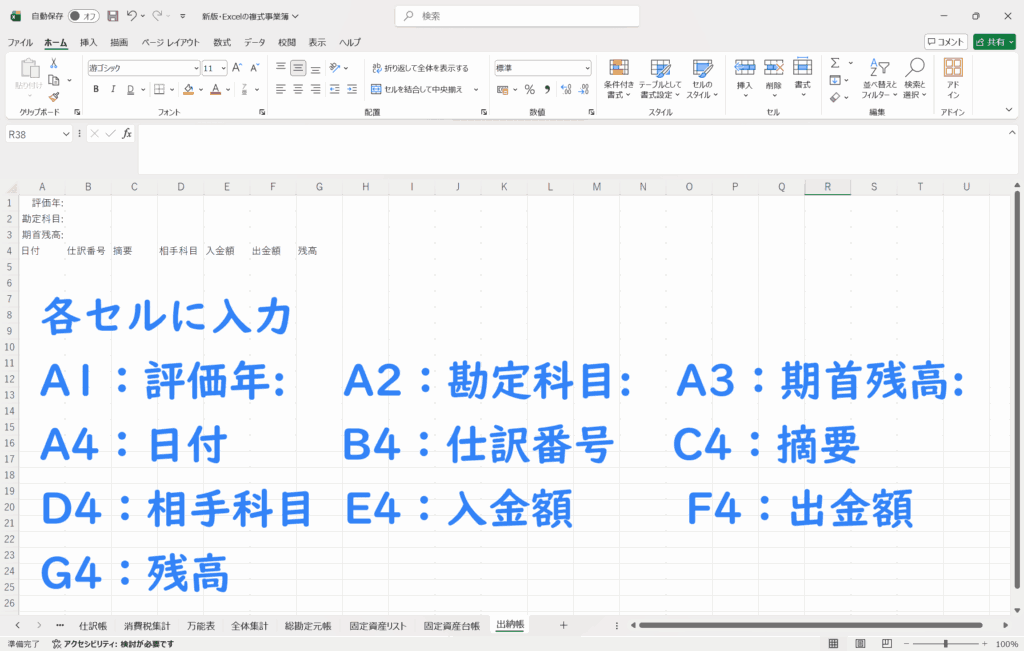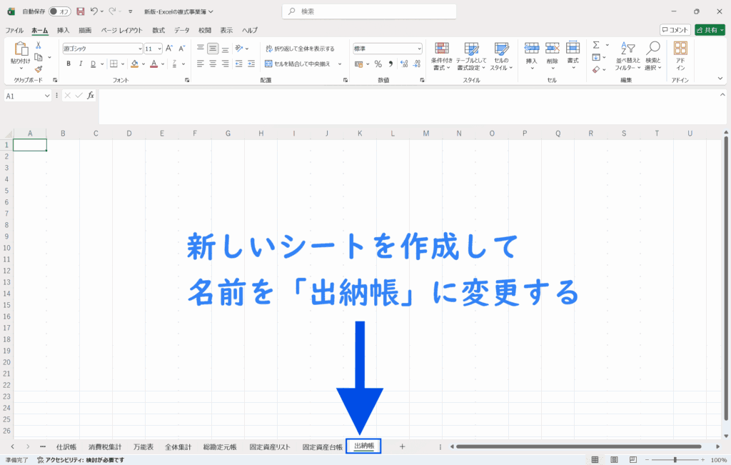 - ①新しいシートを作成して、名前を「出納帳」に変更する