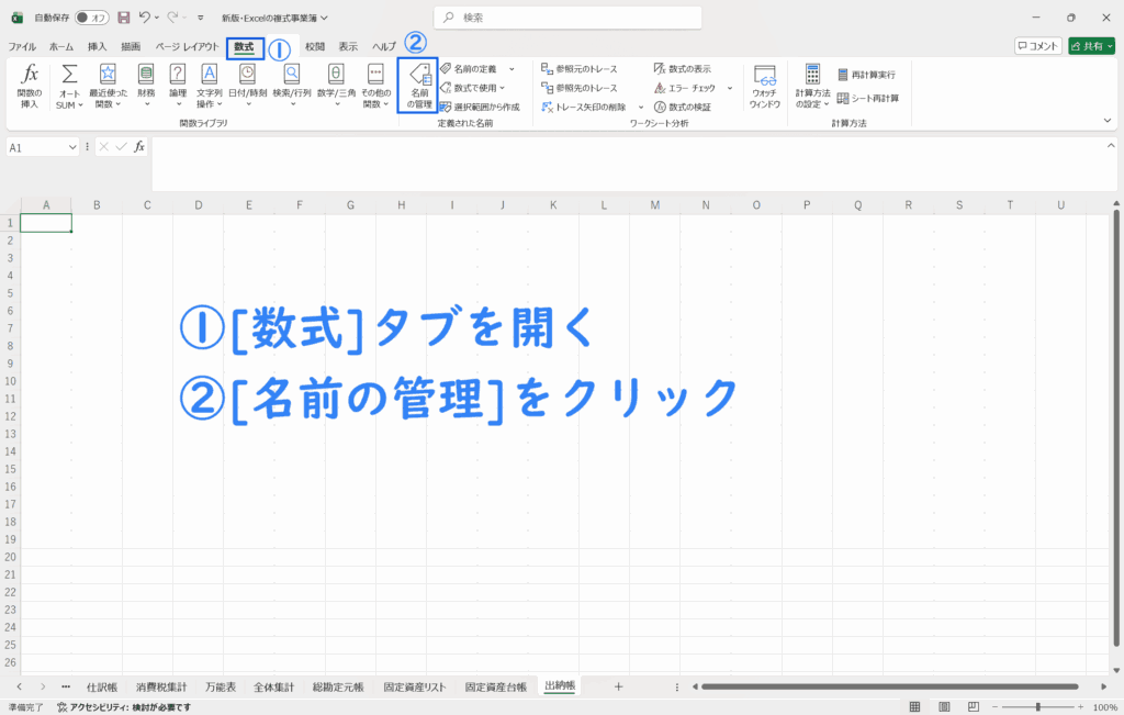 - ②[数式]タブを開き、[名前の管理]をクリック