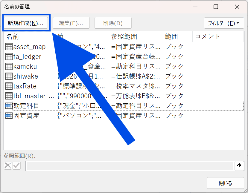 - [新規作成]を開き、[名前:]と[参照範囲:]に以下を入力