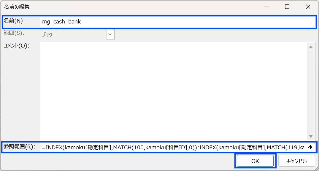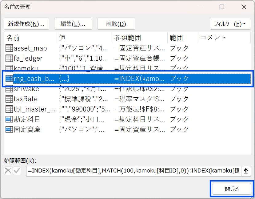 =INDEX(kamoku[勘定科目],MATCH(100,kamoku[科目ID],0)):INDEX(kamoku[勘定科目],MATCH(119,kamoku[科目ID],1)) - 追加されているのを確認して[閉じる]をクリック