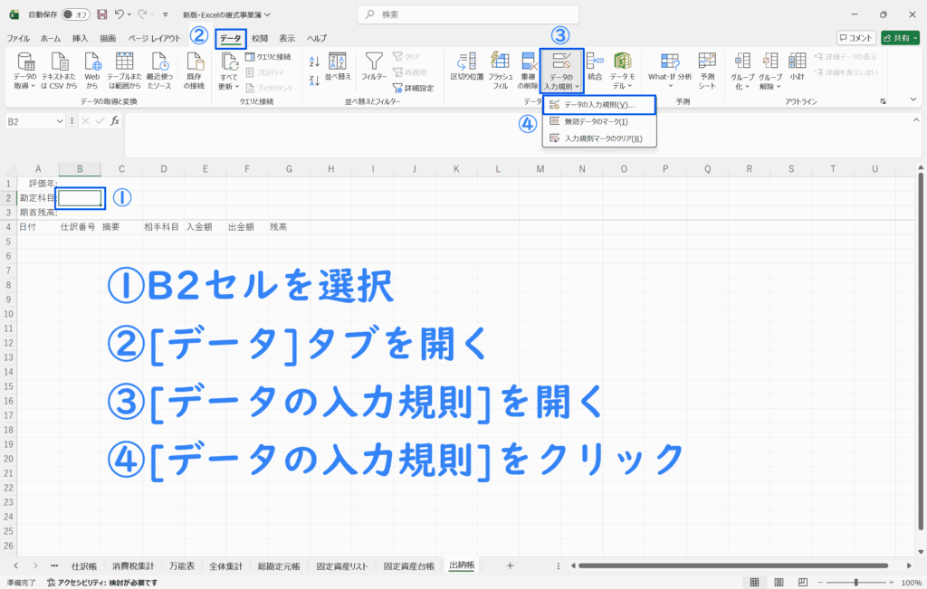 - ⑥B2セルを選択した状態で[データ]タブを開き、[データの入力規則]から[データの入力規則]をクリック