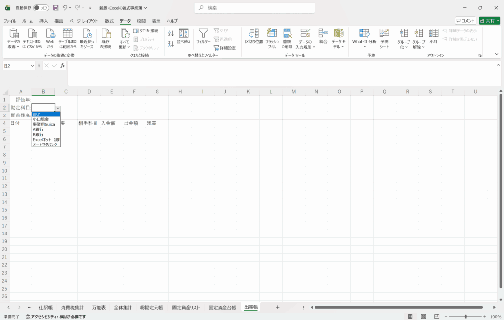 - B2セルのプルダウンリストで現金や預金関係の勘定科目を選べるようになる