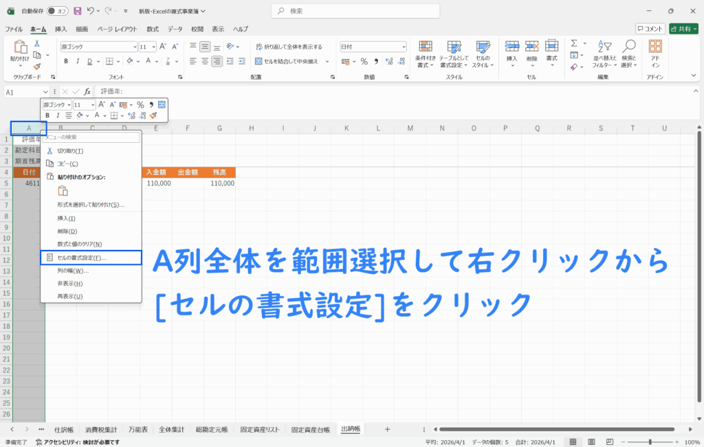 - ⑪日付表示を正しくするため、A列全体を範囲選択した状態で右クリックし、[セルの書式設定]を開く