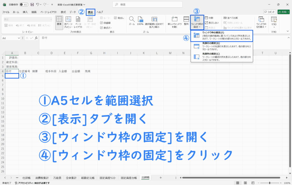 - ⑤A5セルを選択した状態で[表示]タブを開き、[ウィンドウ枠の固定]から[ウィンドウ枠の固定]をクリック